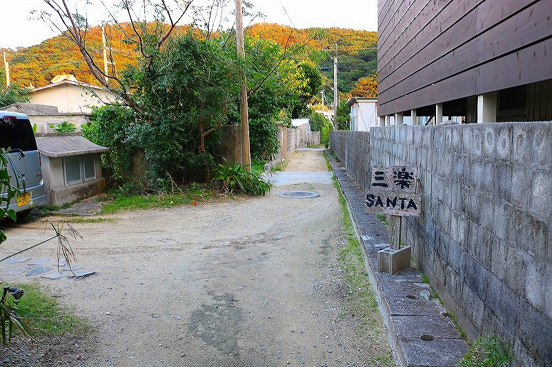 軽自動車がギリギリぐらいで知らなかったら多分曲がらない道で、さすがにレンタカーで行くと壁に擦ってしまいそうなので、歩いて行った方が良いかと思います。